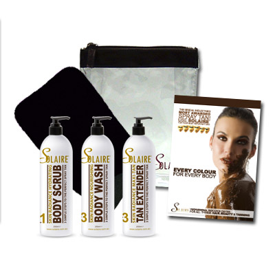Body wash, body scrub, moisturising tan extender plus exfoliating mitt in a travel bag.