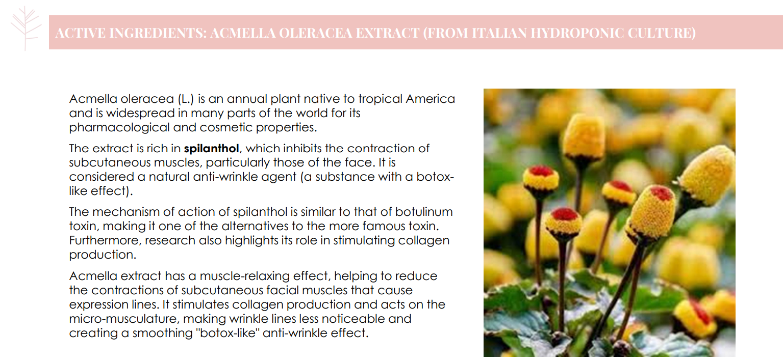 Moisturiser: Anti-wrinkle day face cream. The botox-like peptide and Acmella oleracea extract, from Italian hydroponic technology, relax facial features and expression lines. (refill pouch also available for purchase).